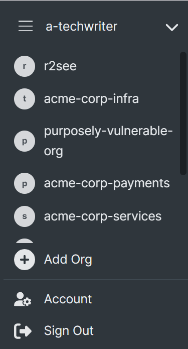 2. Optional: If you have created more than one Semgrep account, select the account you want to make a connection for by clicking on the Navigation bar > Your account name > The account you want to connect.